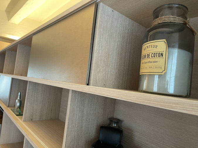 En partie basse les rangements et tiroirs sont recouverts de façades en laque mate teinte “galet”, une couleur douce et minérale qui s’accorde parfaitement aux nuances du chêne blanchi.
