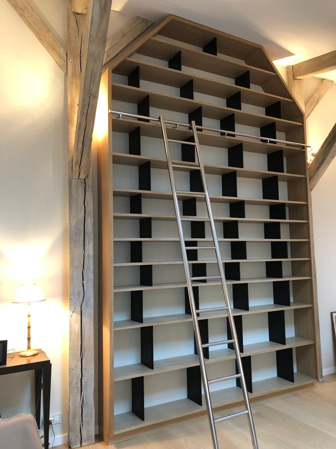 Réalisation d'une bibliothèque de très grande hauteur intégrant une échelle coulissante.